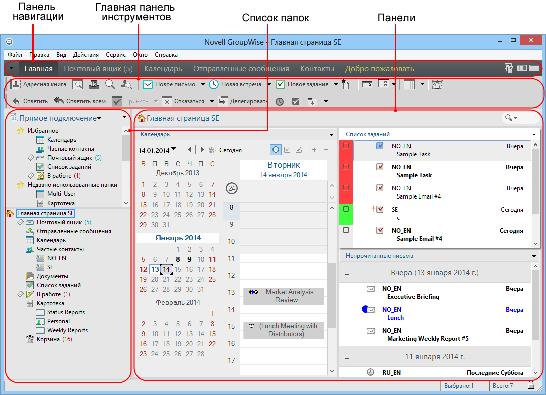 Главная рабочая область в клиенте GroupWise называется основным окном. В главном окне GroupWise можно читать сообщения, планировать встречи, просматривать календарь, управлять контактами, менять режим работы GroupWise, открывать папки и документы и делать многое другое.