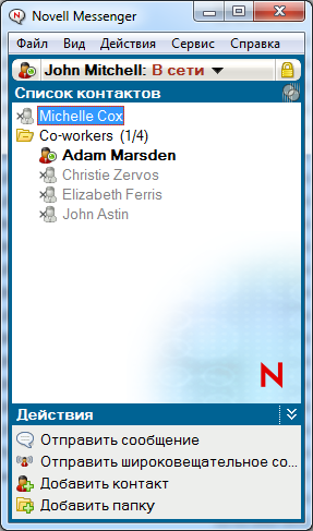 В Novell Messenger можно отправлять сообщения контактам, которые находятся в сети или в режиме ожидания.