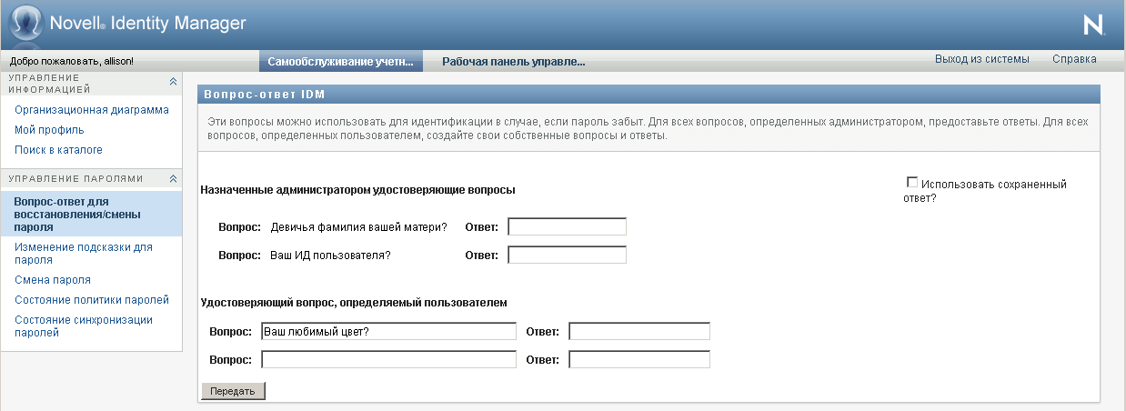 После того как Вы сохраните вопросы запроса-ответа, User Application выведет сообщение об их успешном сохранении и снова покажет экран запроса-ответа пароля с вопросом: "Использовать сохраненный ответ?", который будет выделен.
