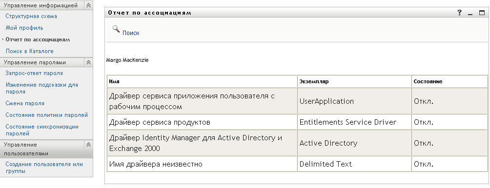 Как администратор, Вы можете использовать страницу "Отчет по ассоциациям" для просмотра и решения проблем со связями, в которых участвуют пользователи. Таблица приложений содержит:
