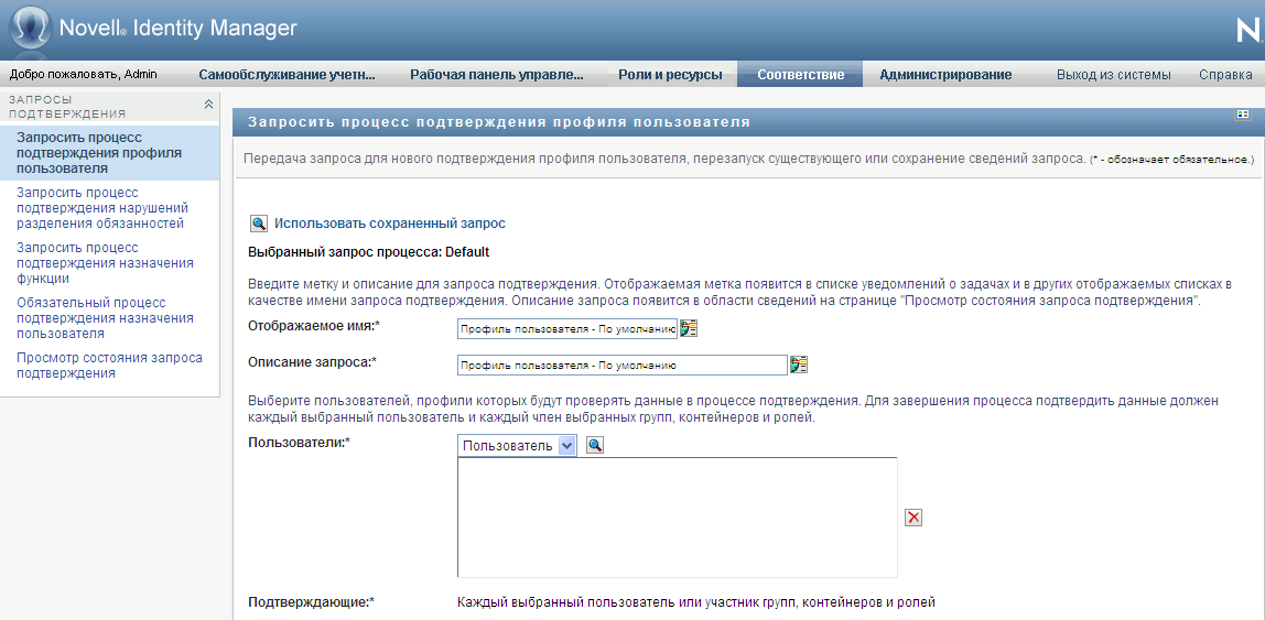 По умолчанию вкладка Соответствие показывает страницу процесса запроса на подтверждение профиля пользователя.