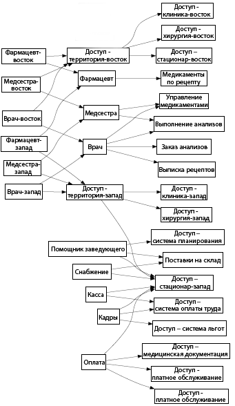Иерархия ролей поддерживает три уровня. Роли, определенные на самом верхнем уровне (они называются бизнес-ролями), задают операции, имеющие смысл для бизнеса в рамках организации. Роли среднего уровня (или ИТ-роли) поддерживают технологические функции. Роли, определенные на самом нижнем уровне (это роли-разрешения), задают привилегии низкого уровня. Следующий пример демонстрирует образец иерархии ролей с тремя уровнями для медицинской организации. Самый верхний уровень иерархии показан слева, а самый нижний - справа: