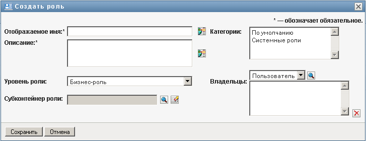 User Application покажет диалоговое окно "Создать роль":
