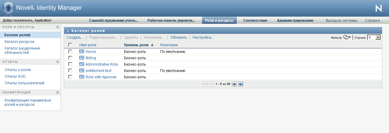 User Application покажет список ролей, в настоящее время определенных в каталоге.