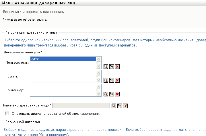Администраторам приложения обеспечения правами доступа приложение User Application предоставляет следующий интерфейс, позволяющий определять назначения доверенных лиц: