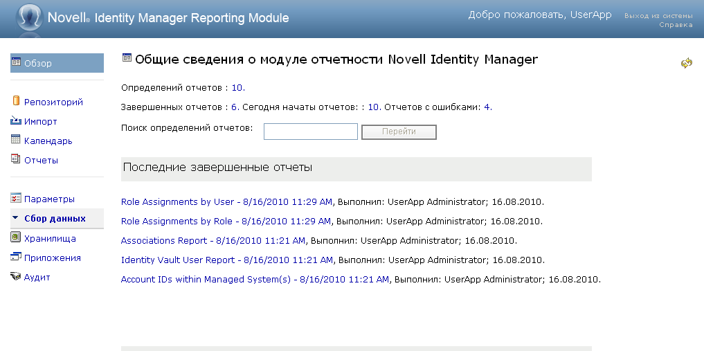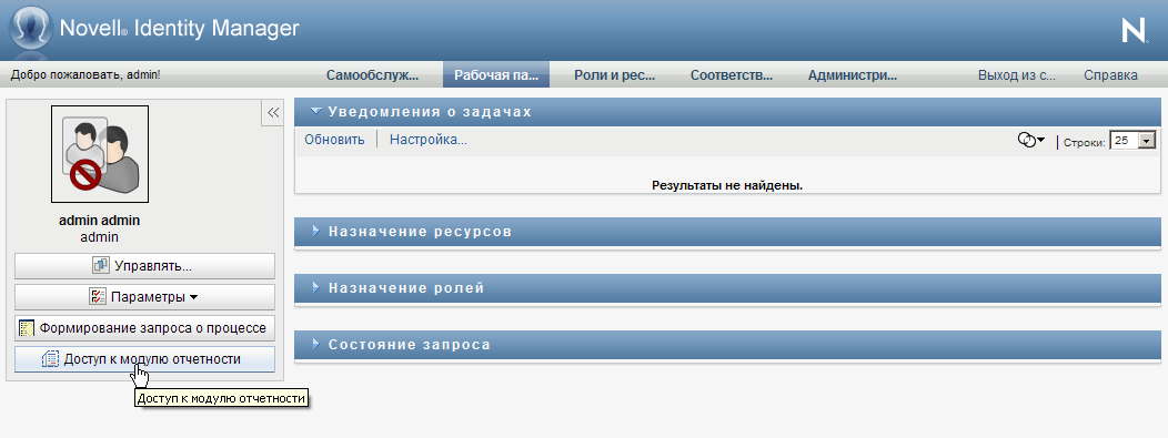 Единая регистрация (SSO): поведение. Если для модуля Novell Identity Manager Roles Based Provisioning Module включена единая регистрация (SSO), страница входа открываться не будет. В этом случае вход в модуль создания отчетов выполняется автоматически.