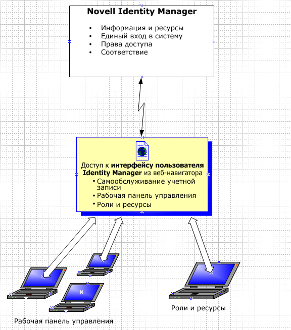Рисунок 1-1 IDM User Application предоставляет пользовательский интерфейс для Identity Manager