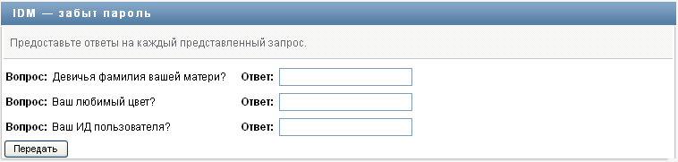 Сразу же после входа в Identity Manager User Application Вы можете получить запрос и на другие сведения. Это зависит от того, как системный администратор настроил Вашу политику пароля (при его наличии). Пример: