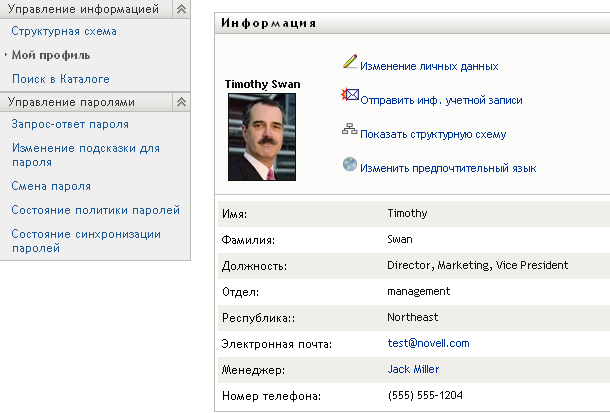 Ниже приведен сценарий создания ссылки на подробные сведения о другом пользователе или группе. Тимоти Сван (вице-президент по маркетингу) входит в Identity Manager User Application и переходит на страницу "Мой профиль":