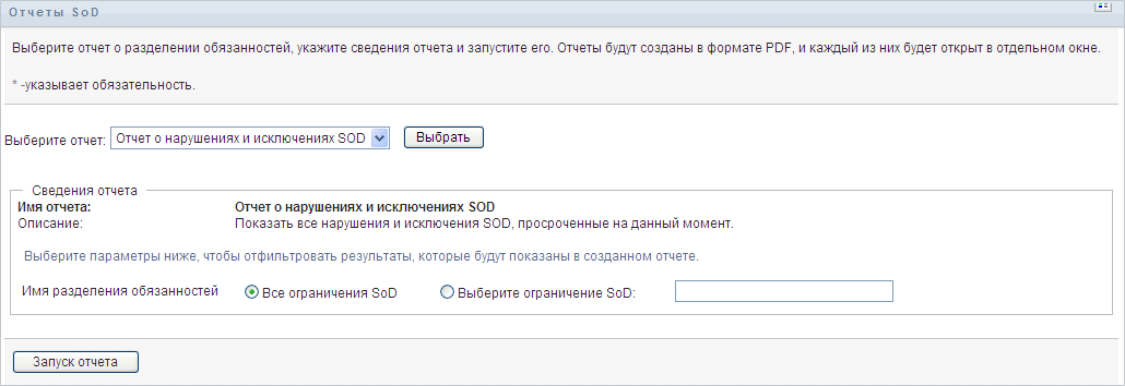Чтобы создать и просмотреть отчет об ограничениях SoD: