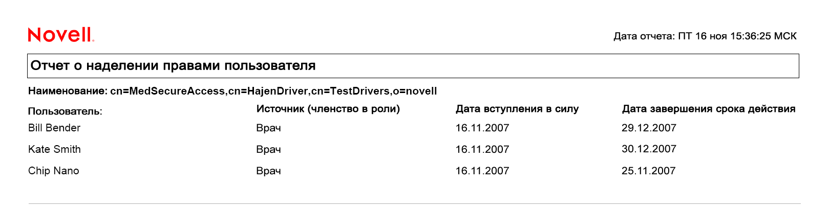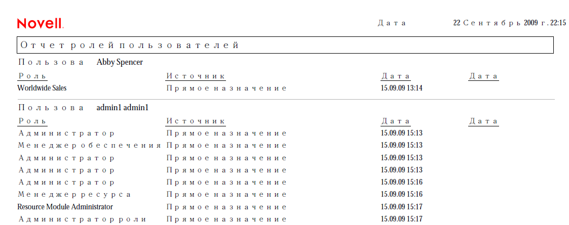 Рисунок 19-5 Отчет о полномочиях пользователей: детали пользователя для каждого полномочия