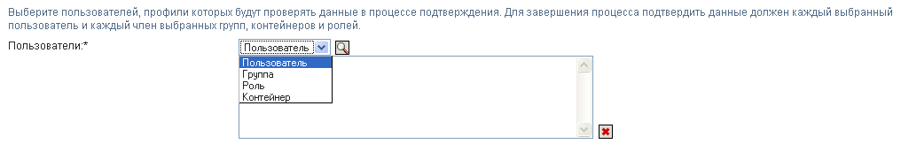 Обратите внимание, что поле доступно только для чтения. В процессе подтверждения профилей пользователей подтвердителями являются пользователи, выбранные в поле , вместе со всеми пользователями любых групп, ролей и контейнеров, добавленных вами в поле . Это обусловлено тем, что каждый пользователь должен быть подтвердителем своего собственного профиля; ни один другой пользователь не может быть подтвердителем.