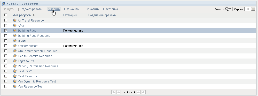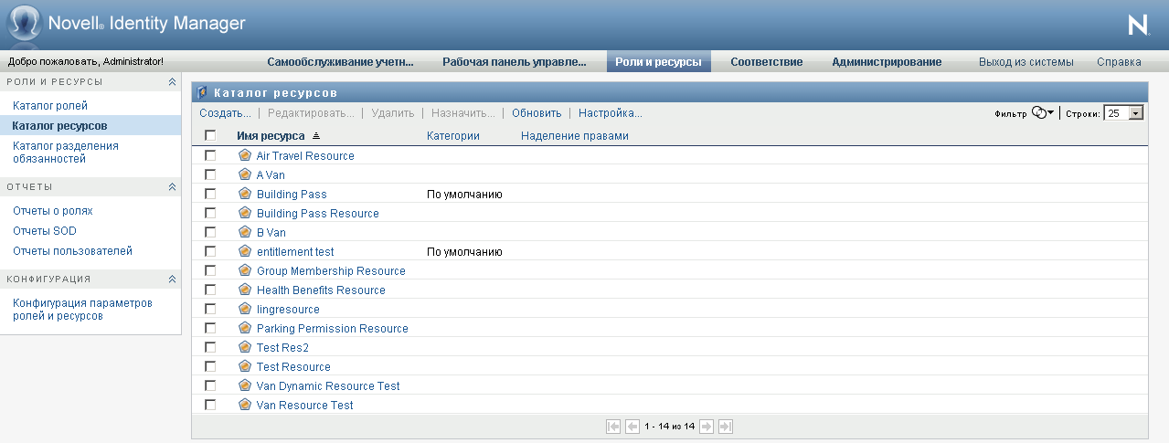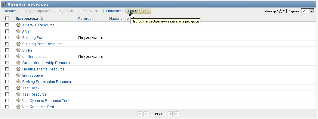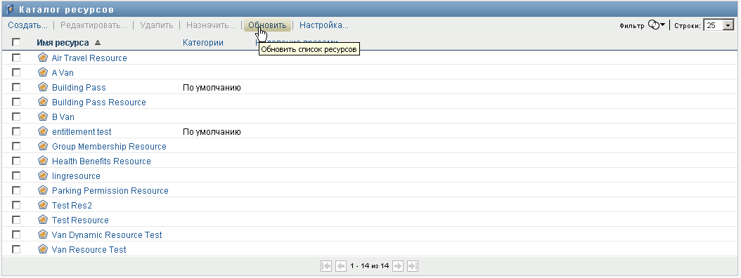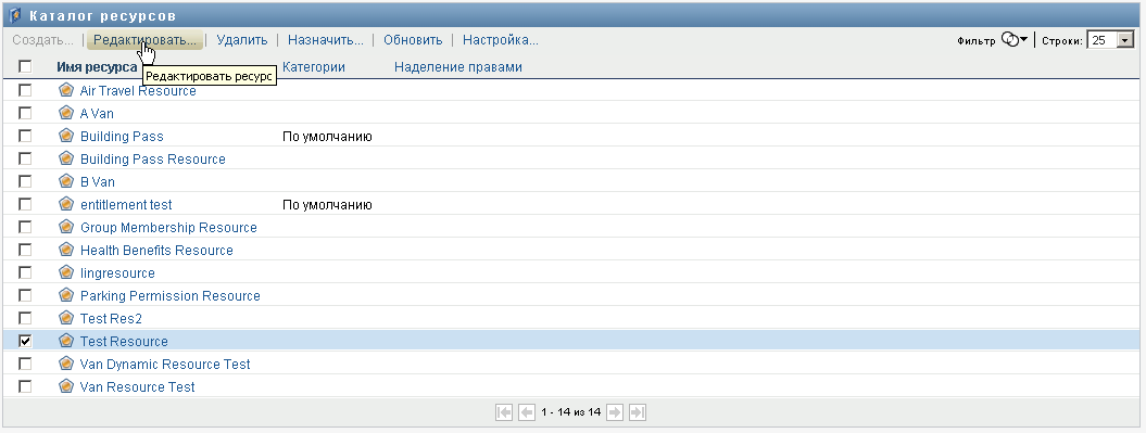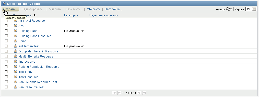 Действие на вкладке интерфейса пользователя Identity Manager позволяет просматривать ресурсы, ранее определенные в каталоге. Также оно позволяет создавать новые ресурсы и изменять, удалять и назначать имеющиеся ресурсы.