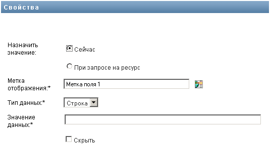 Введите отображаемую метку для поля, а также тип данных и значение. Поддерживаются следующие типы данных: