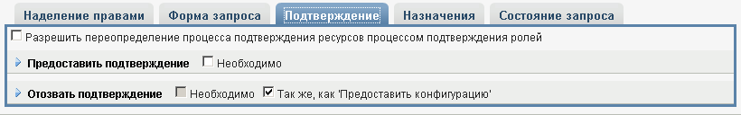 Если установлен флажок , процесс подтверждения роли всегда будет переопределять процесс подтверждения ресурса при каждом связывании ресурса с ролью. После подтверждения связанной роли ресурс автоматически обеспечивается правами доступа без необходимости какого-либо подтверждения.