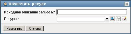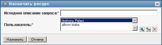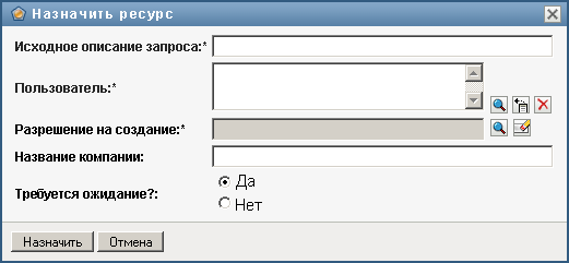 Поля и являются обязательными во всех формах запросов о ресурсах. Для выбора пользователей, которым назначается ресурс, можно использовать элемент "Выбор объектов".