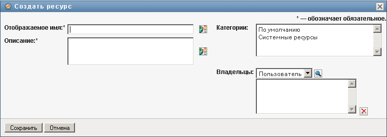 Текст, используемый при показе имени ресурса в User Application. При создании ресурса в поле нельзя использовать следующие символы: < > , ; \ " + # = / | & * Можно перевести это имя на один из языков, поддерживаемых приложением User Application. См. дополнительные сведения: Таблица 1-1, Стандартные кнопки. |