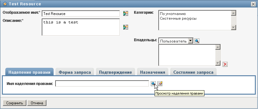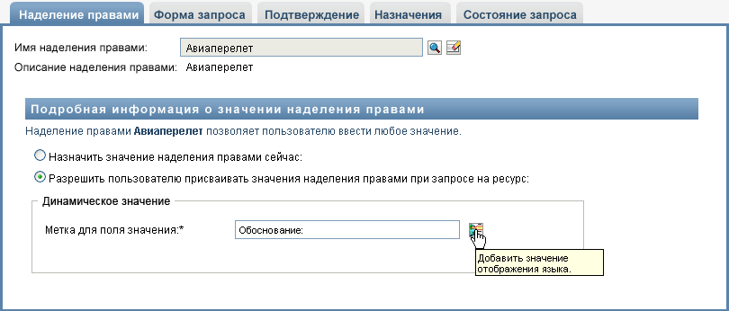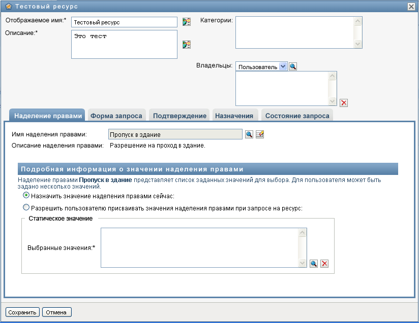 При выборе опции необходимо выбрать пользовательское определение подтверждения назначения ресурса. Это имя запроса на обеспечение правами доступа, исполняемого при запросе ресурса. |