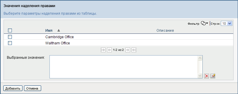 Для выбора значений наделения правами используйте элемент "Выбор объектов":