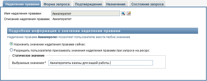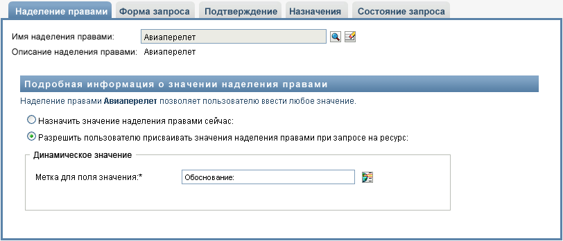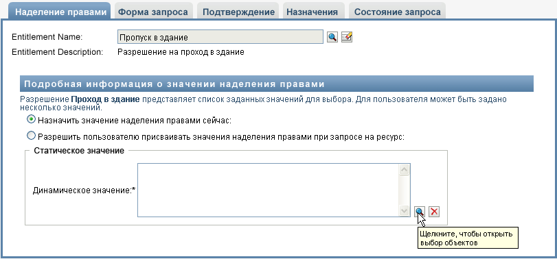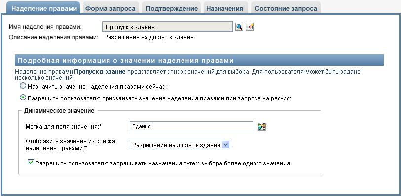 Наделение правами, требующее ввода одного или нескольких параметров. Например, можно привязать ресурс к наделению правами под названием "Пропуск в здание", которое позволяет запрашивающему выбрать одно или несколько зданий. Допустимые значения приводятся в списке наделения правами, который может включать статический список значений, определяемый администратором, или динамический список значений, генерируемый LDAP. Можно задать значение при конструировании, когда Вы определяете ресурс, или позволить пользователю назначить значение во время запроса. См. дополнительные сведения: Привязка к наделению правами с несколькими параметрами. |