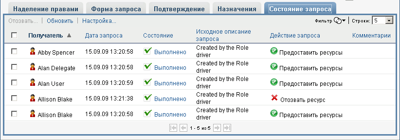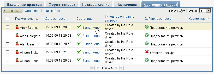 Действие позволяет увидеть состояние Ваших запросов о назначении ресурсов, в том числе запросов, сделанных Вами как напрямую, так и путем назначения ролей. С его помощью можно увидеть текущее состояние каждого запроса. Кроме того, это действие дает Вам возможность отозвать запрос, обработка которого еще не завершена или не была прервана, если Ваши намерения изменились и Вы не хотите, чтобы запрос был выполнен.