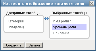 позволяет Вам выбирать и отменять выбор столбцов, а также менять порядок расположения столбцов в просматриваемом списке ролей. Это определяется настройкой в диалоговом окне "Настроить отображение каталога ролей". При изменении списка столбцов или изменении порядка их расположения эти настройки сохраняются в хранилище вместе с Вашими пользовательскими настройками.