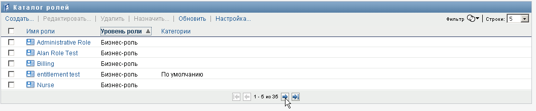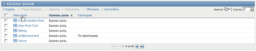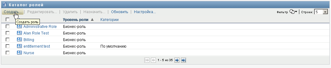 Действие на вкладке интерфейса пользователя Identity Manager позволяет просматривать роли, ранее определенные в каталоге. Кроме того, оно позволяет создавать новые роли и изменять, удалять и назначать уже имеющиеся.