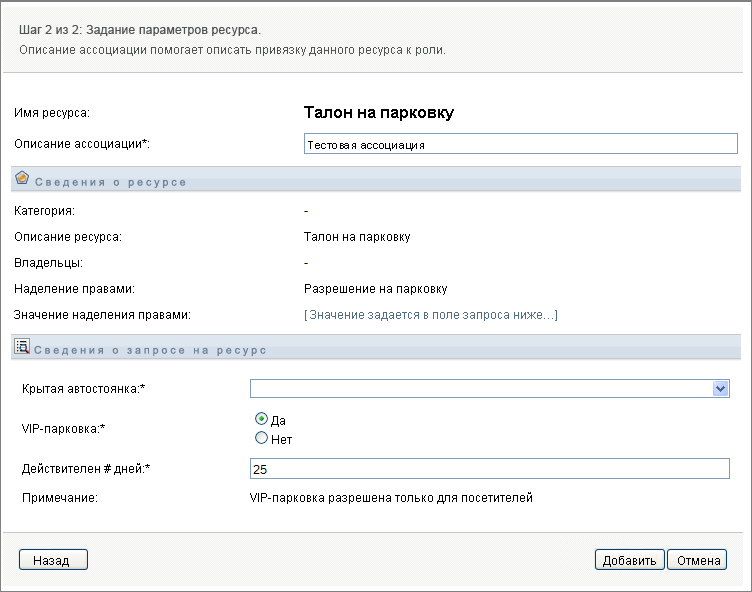 Если наделение правами требует статических значений параметров, которые описывают дополнительные атрибуты или несут подробную информацию о наделении правами, мастер показывает эти статические значения рядом с меткой . Если наделение правами требует динамических параметров, мастер показывает форму запроса о ресурсе с полями для динамических параметров, а также вспомогательными полями.