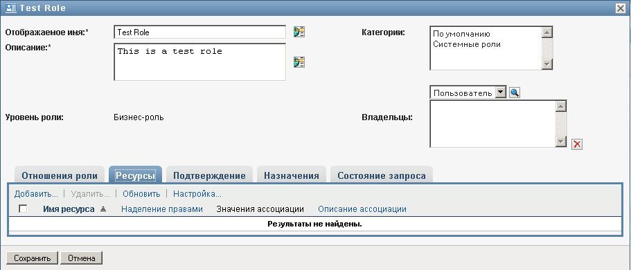 ПРЕДУПРЕЖДЕНИЕ.Менеджер ролей, имеющий разрешение "Удалить роль" для системных ролей (или контейнера, содержащего эти роли), может удалять системные роли. Системные роли не следует удалять. Если какая-либо из системных ролей удалена, работа User Application будет нарушена.