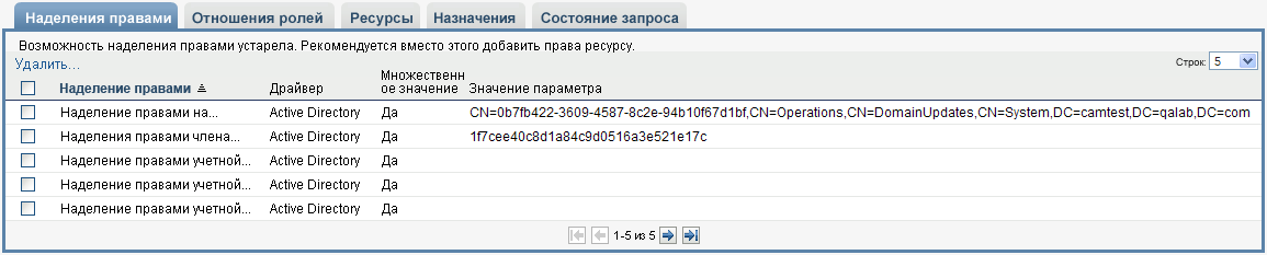 Наделения правами, связанные с существующими ролями. Роли, определенные в более ранних выпусках модуля Novell Identity Manager Roles Based Provisioning Module, могут быть связаны с определенными политиками наделения правами. Если с ролью связаны определенные политики наделения правами, в интерфейсе пользователя будет отображаться вкладка , которая позволяет просматривать политики наделения правами, а также удалять их. Политики наделения правами работают и в данном выпуске, но теперь компания Novell рекомендует связывать их с ресурсами, а не с ролями.