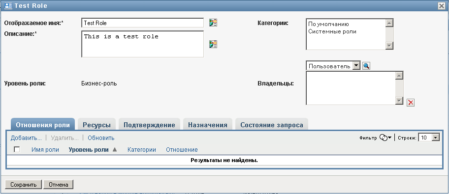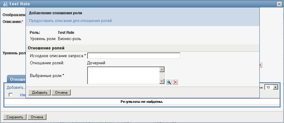 Роли среднего уровня (ИТ-роли) могут содержать роли более низкого уровня и, в свою очередь, входить в состав ролей более высокого уровня. Страница "Отношения ролей" позволяет добавить либо нижестоящую (дочернюю), либо вышестоящую (родительскую) роль.
