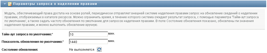 Эти параметры управляют поведением запросов о наделении правами, выполняемых User Application. Можно определить время ожидания и частоту обновления запросов о наделении правами. Кроме того, Вы можете увидеть, обновлялись ли значения параметров наделения правами, и начать обновлять их вручную, если это необходимо.