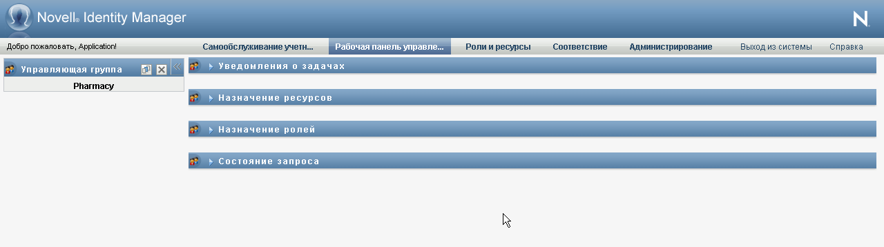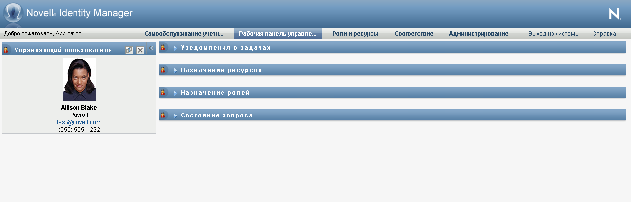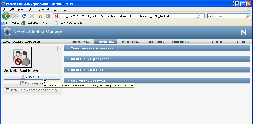 При выборе пользователя, группы, контейнера или роли рабочая панель управления включает для Вас режим управления и обновляет раздел "Профиль пользователя" в левой части экрана. Раздел "Профиль пользователя" обновляется следующим образом: