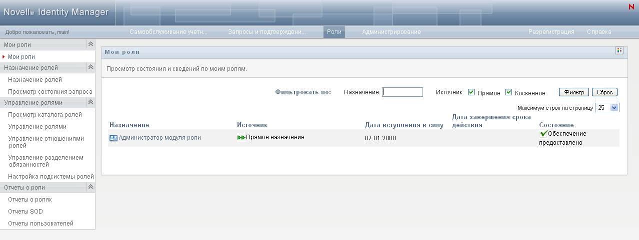 По умолчанию на вкладке открывается и отображается страница "Мои роли".