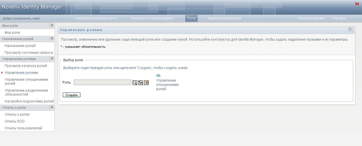 Страница "Управление ролями" отображает имя роли, которая в данный момент выбрана в разделе .