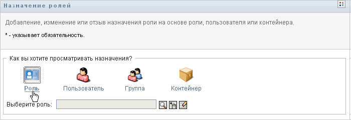 Выберите роль, которую хотите назначить пользователям, группам или контейнерам.