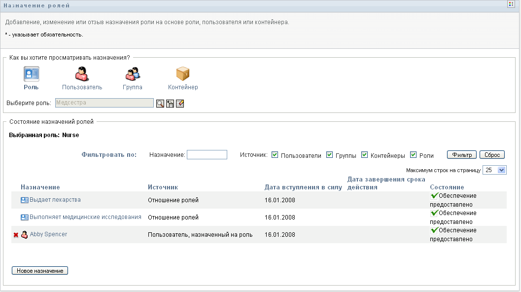 User Application отобразит текущее состояние назначений для выбранной роли.