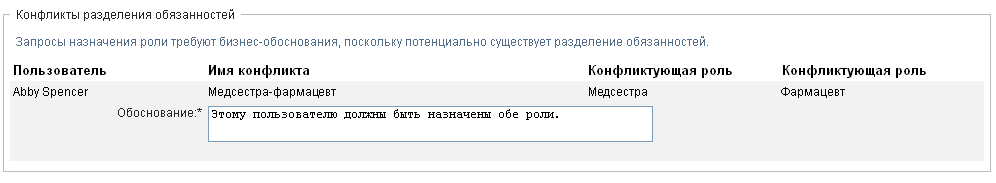 Если при назначении роли текущему выбранному пользователю может возникнуть конфликт разделения обязанностей, то интерфейс пользователя в нижней части страницы отобразит окно . В этом случае Вам необходимо предоставить обоснование назначения роли с точки зрения бизнеса.