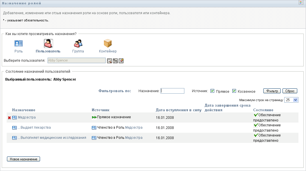 User Application отобразит текущее состояние назначений для выбранного пользователя.