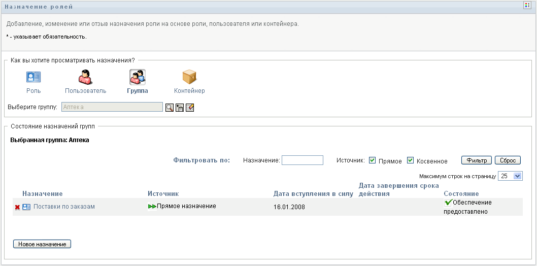 User Application отобразит текущее состояние назначений для выбранной группы.