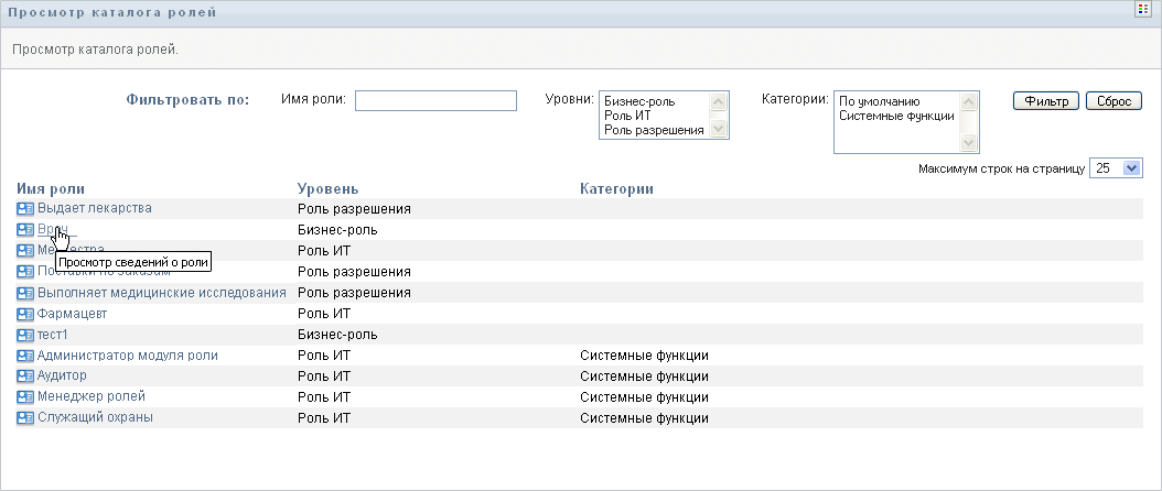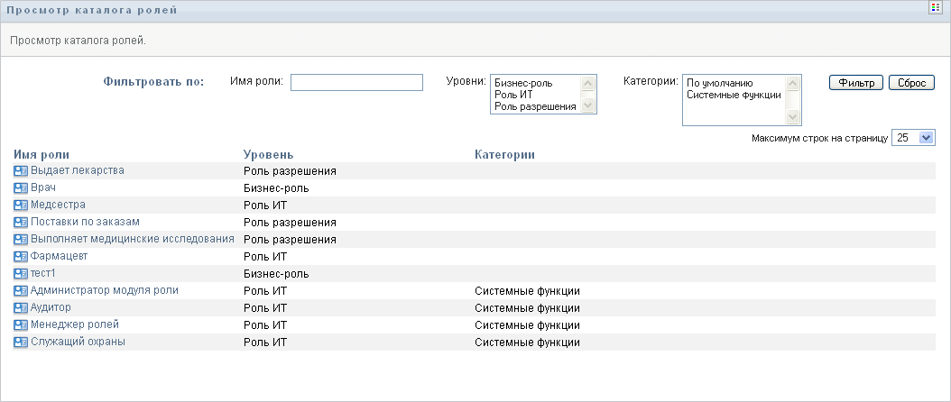 В столбце перечисляются категории, связанные с ролью. В бизнес-среде с помощью категорий можно организовать роли справочника. Категорию, с которой связаны роли, можно при просмотре каталога использовать как фильтр.