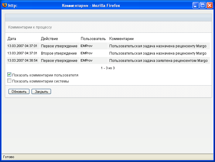 Появится всплывающее окно, в котором можно увидеть пользовательские и системные комментарии. Порядок отображения комментариев определяется отметкой времени, связанной с каждым из них. Более старые комментарии отображаются первыми. Для параллельных процессов подтверждения порядок действий, обработанных одновременно, может быть непредсказуемым.