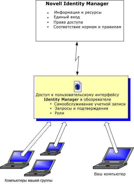 Чтобы Вы и Ваша группа могли воспользоваться этими преимуществами, пакет Identity Manager User Application предоставляет пользовательский интерфейс, доступный из веб-навигатора.