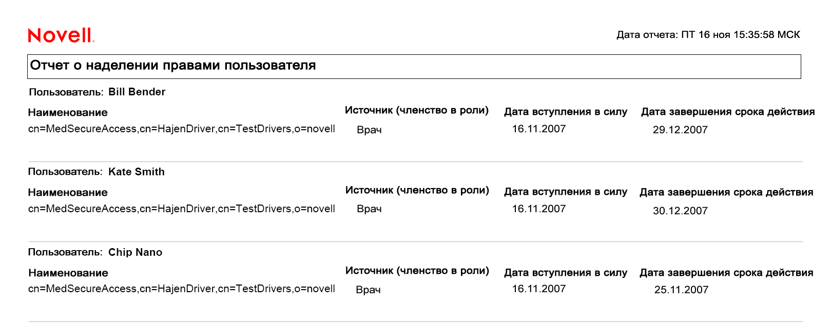 Рисунок 18-5 Отчет о полномочиях пользователей: детали пользователя для каждого полномочия