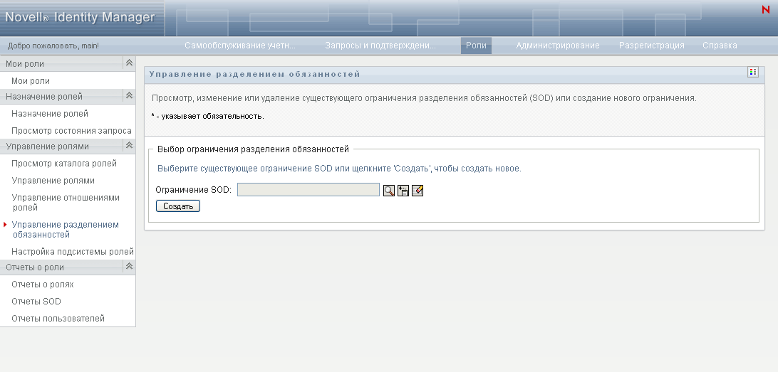 Доступ к странице Доступ к странице "Управление разделением обязанностей" предоставляется администраторам модуля ролей и сотрудникам системы безопасности. Сотрудникам системы безопасности требуются права просмотра для контейнера SoDDef в хранилище Identity Vault, но не нужны права просмотра для ролей.