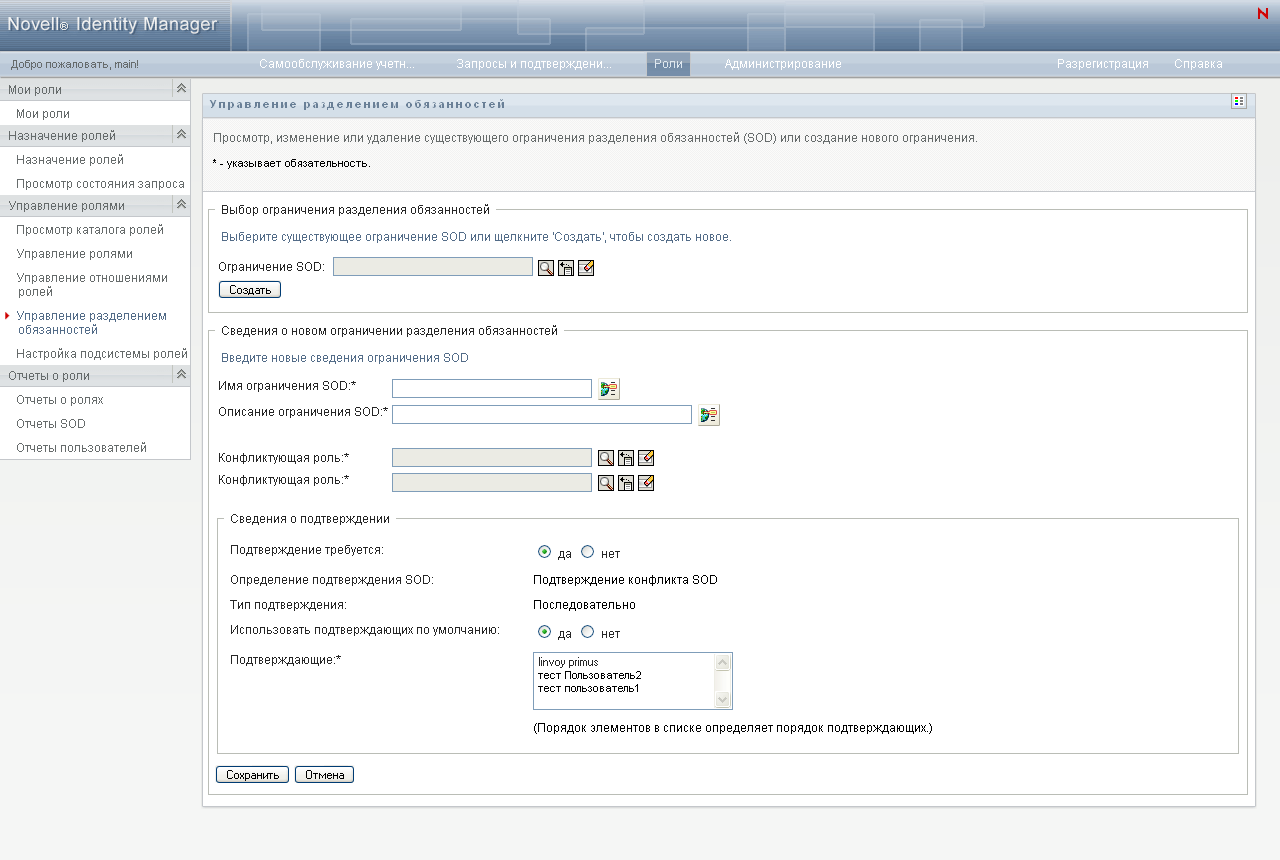 Ограничение SoD - это правило, согласно которому две роли одного уровня становятся взаимоисключающими. Если пользователю назначена одна роль, ему не может быть назначена вторая роль пары, если для данного ограничения не разрешено исключение. Вы можете определить, будут ли исключения для ограничения разрешены всегда или только после выполнения процедуры утверждения.