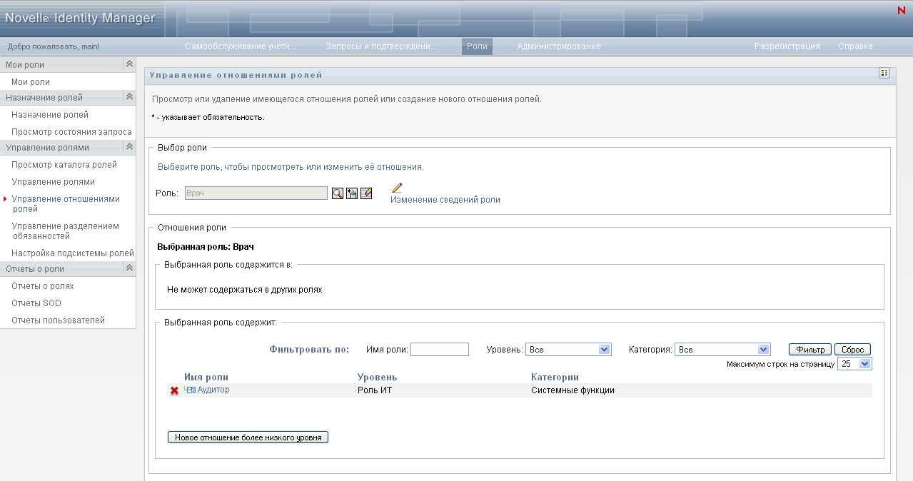 Роли самого нижнего уровня (роли-разрешения) могут входить в состав ролей более высокого уровня, но не могут содержать другие роли самого нижнего уровня. Страница "Отношения ролей" позволяет добавлять только "Новые роли более высокого уровня".