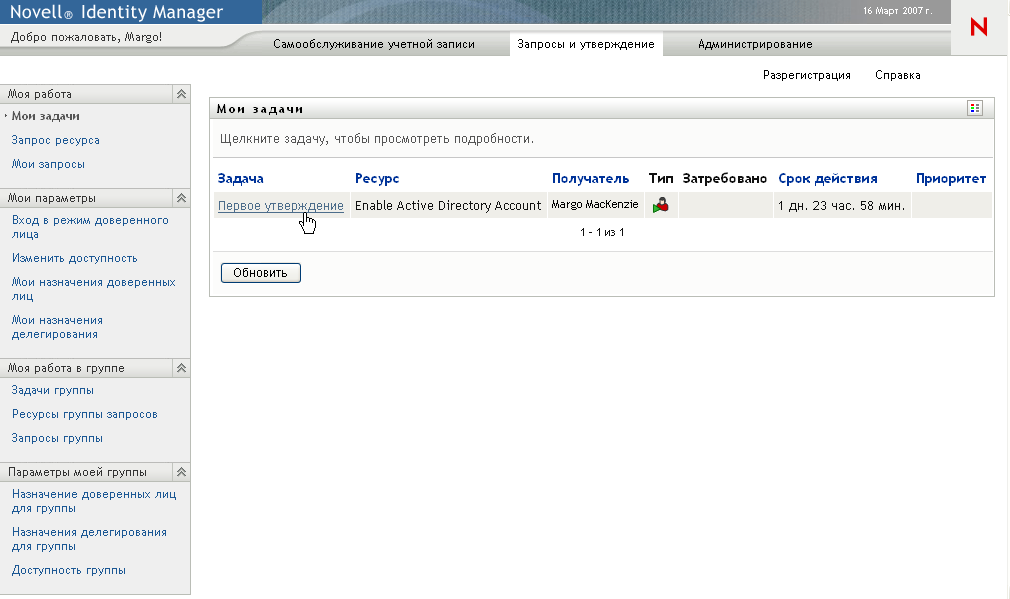 Действие позволяет работать с задачами рабочего процесса, связанными с запросами на ресурсы, запросами функций и запросами на подтверждение. В некоторых случаях пользовательский интерфейс может отличаться в зависимости от того, какой тип задачи рабочего процесса вы выбрали для работы. Для запросов на подтверждение действие показывает только те задачи, для которых вы назначены подтвердителем.