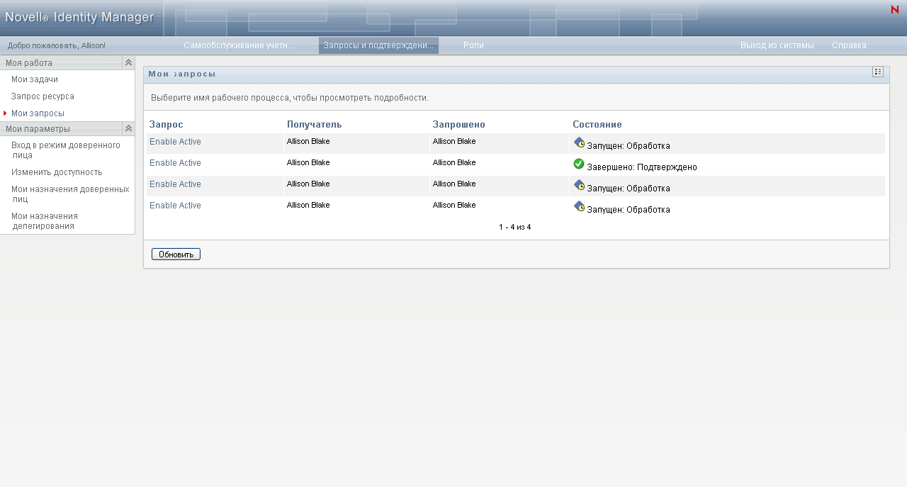 На странице "Запрос ресурса" будут отображены Ваши запросы. В список включены активные запросы, а также запросы, которые уже подтверждены или запрещены. Администратор может контролировать, как долго будут храниться результаты рабочего процесса. По умолчанию система рабочего процесса хранит его результаты в течение 120 дней.
