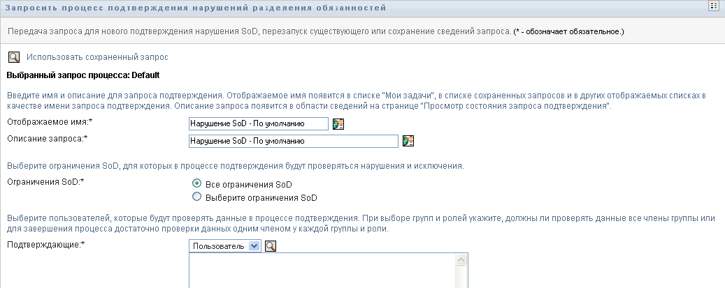 Для запуска процесса подтверждения необходимо выбрать хотя бы одно ограничение SoD. Однако для сохранения запроса выбор ограничения не обязателен.